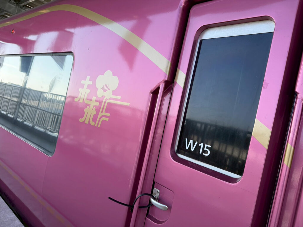 めちゃめちゃピンクピンク(紅梅色?)したカラーに、車両をイメージにしたレイアウト!