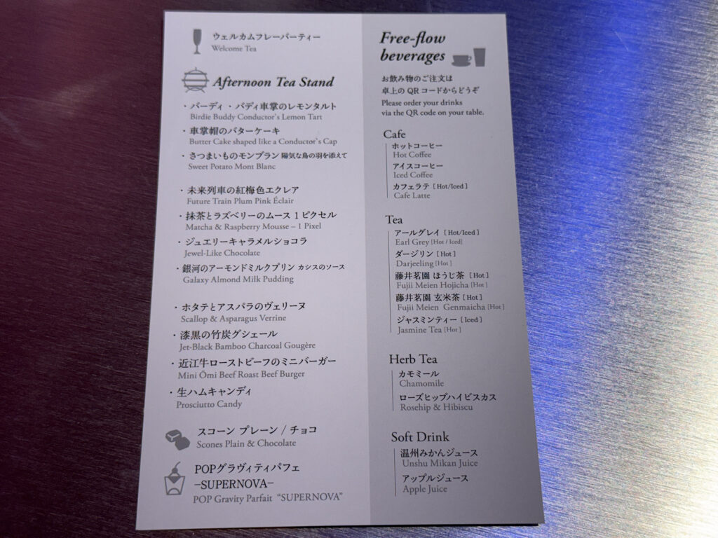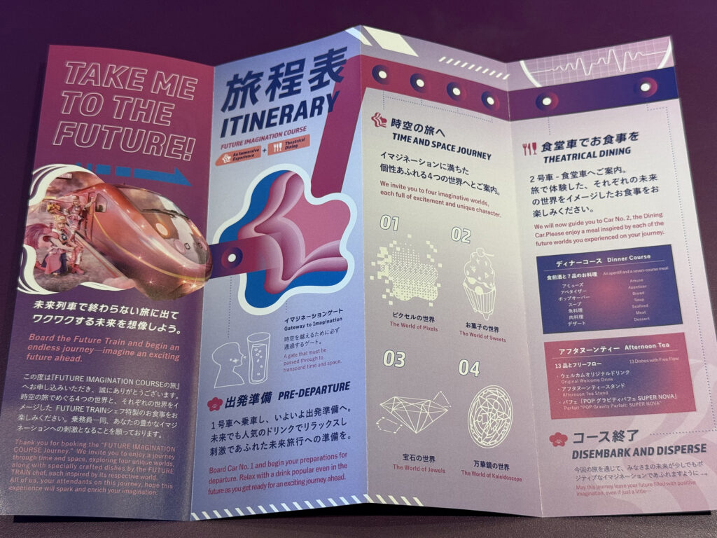 FUTURE TRAINでは、以下の通り複数の楽しみ方が提供されていますが、今回は一番のおすすめということで、「FUTURE IMAGINATION COURSE」のアフタヌーンティー(税込5,000円/人)を予約しました。