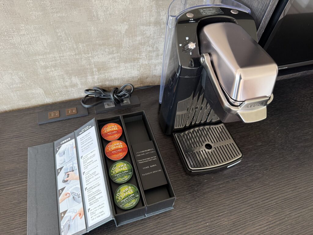 コーヒーマシン&冷蔵庫内。コーヒーはいつも飲みたいと思いながら、結局ラウンジや朝食時にいただいてしまうので、部屋では飲まずにそのまま帰ってしまうことが多い。。。(今回も)