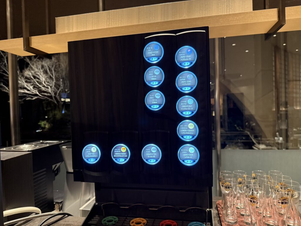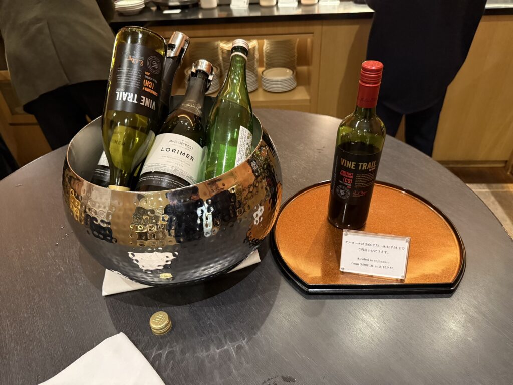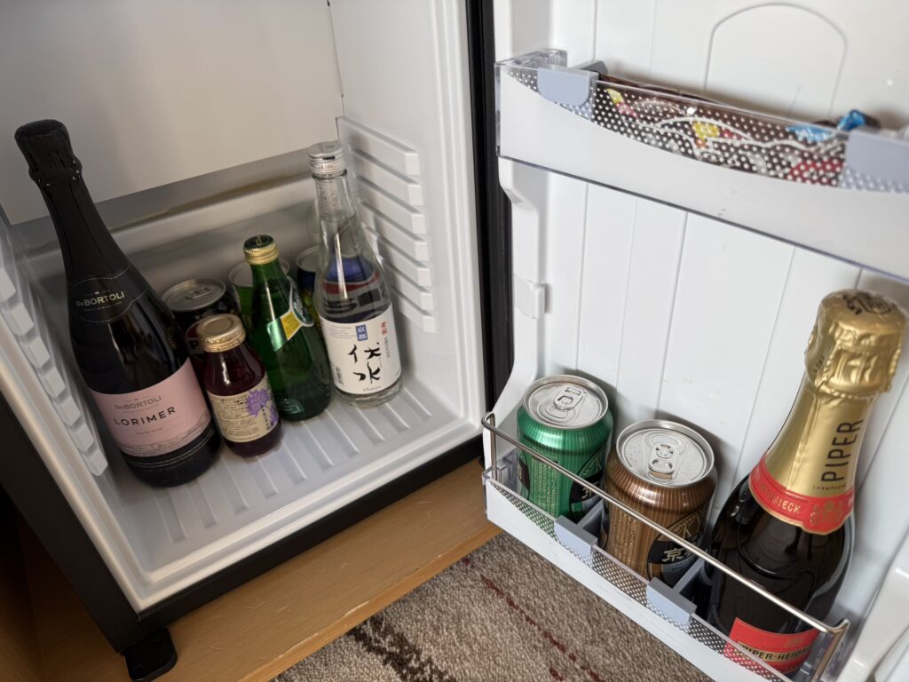 冷蔵庫内のピンクラベルのスパークリングワインはウエルカムドリンク。ソフトドリンクも無料で飲めるとのこと。それ以外のアルコールドリンクは有料です。