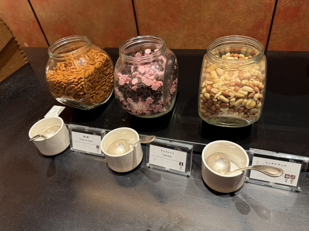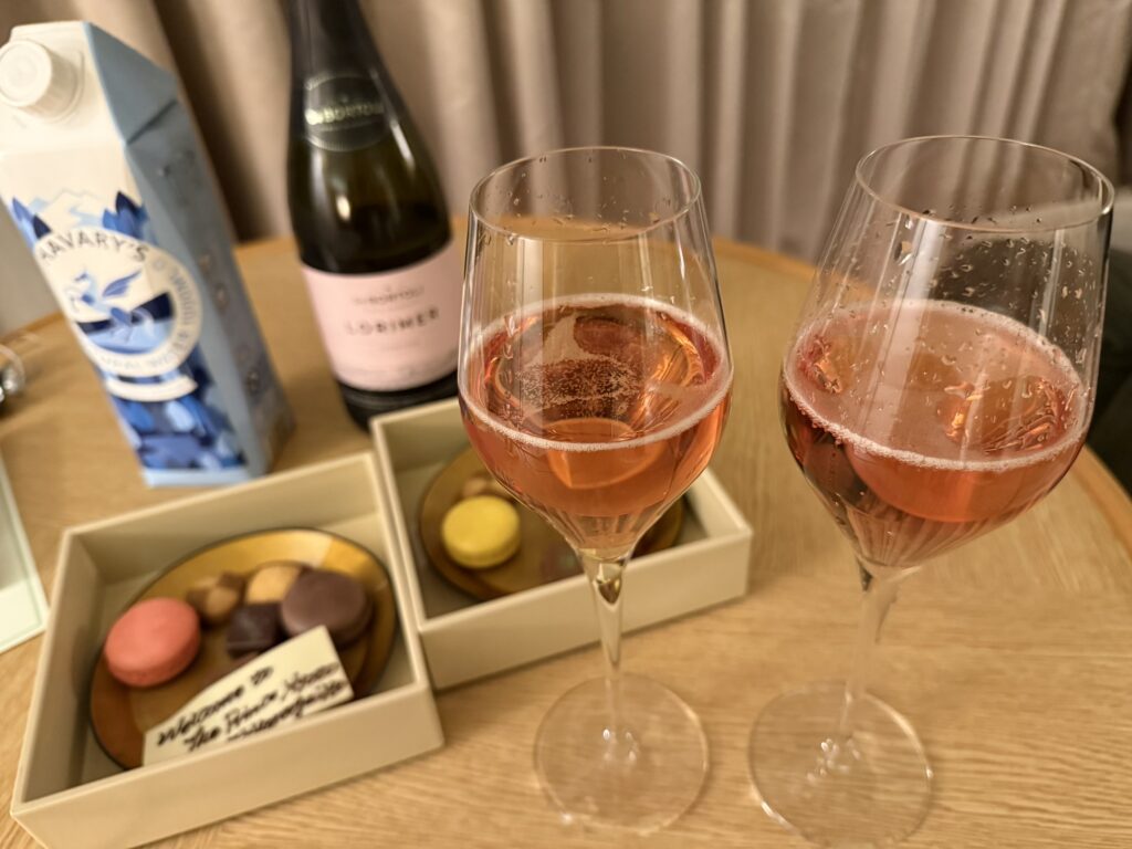 チョコレートに加え、マカロンやカヌレまであって、ちょっとしたアフタヌーンティー。部屋にはコーヒーマシンとウエルカムドリンクのスパークリングワインもあるので、わざわざラウンジに行かなくてもお部屋で十分楽しめそうです!(いや、せっかくなのでラウンジ行きますけどね!)