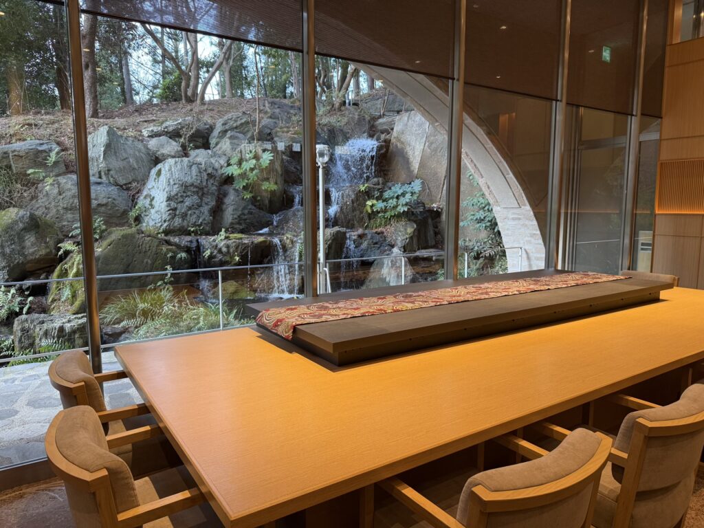中庭とは異なる、滝の流れる庭園が見えるラウンジ。