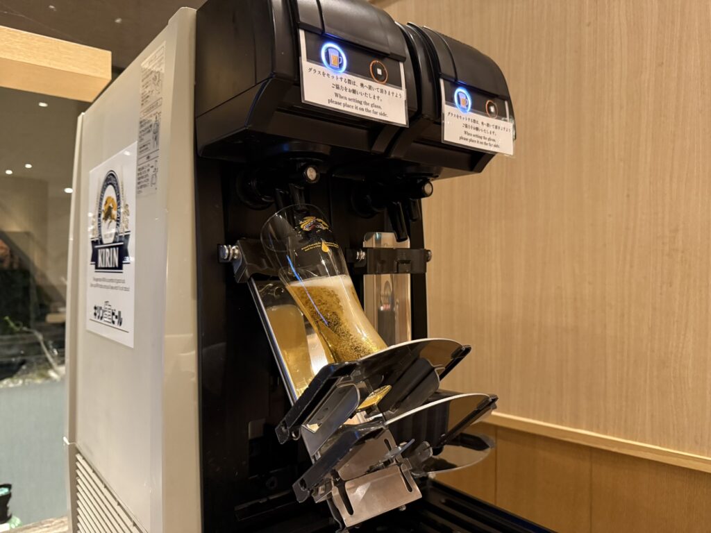 お酒はいろいろ種類ありますが・・・やっぱり最初は炭酸系が飲みたいということで、結局ビール。でも、いろんな種類のお酒がたくさん並んでいるだけでちょっとテンション上がる。笑