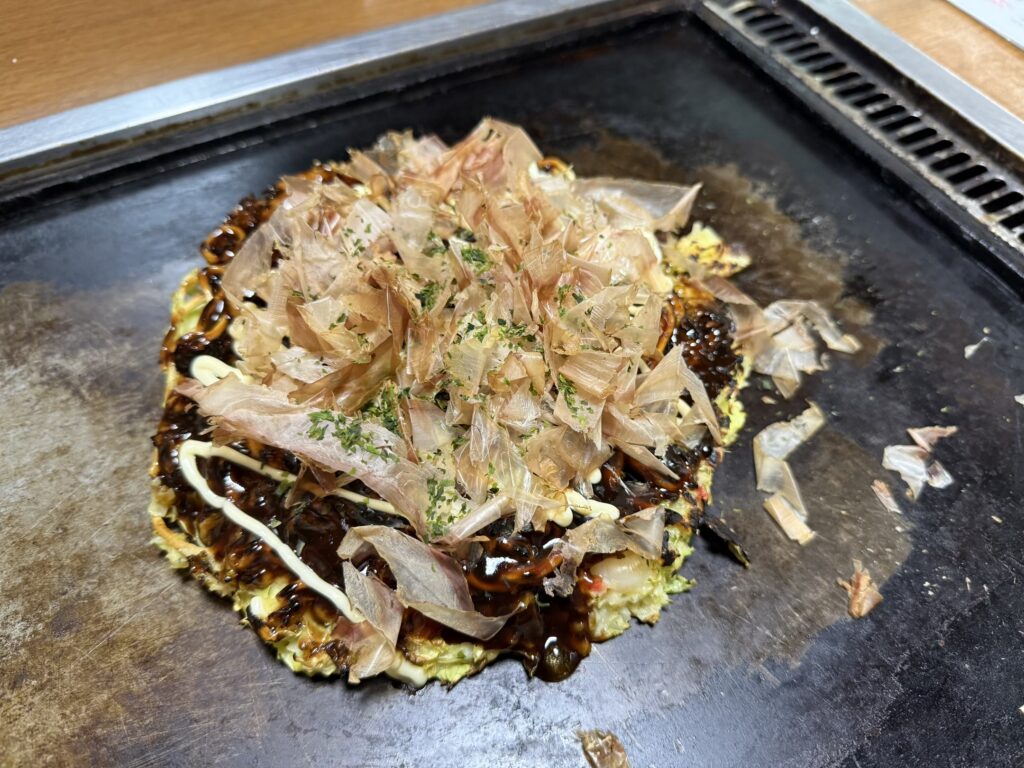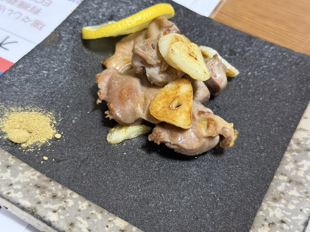 お好み焼きやモダン焼きに加え、写真の砂肝焼きや貝柱焼きなど焼き物もたくさん。アットホームな雰囲気のお店で、ゆったりした夜を過ごせました!