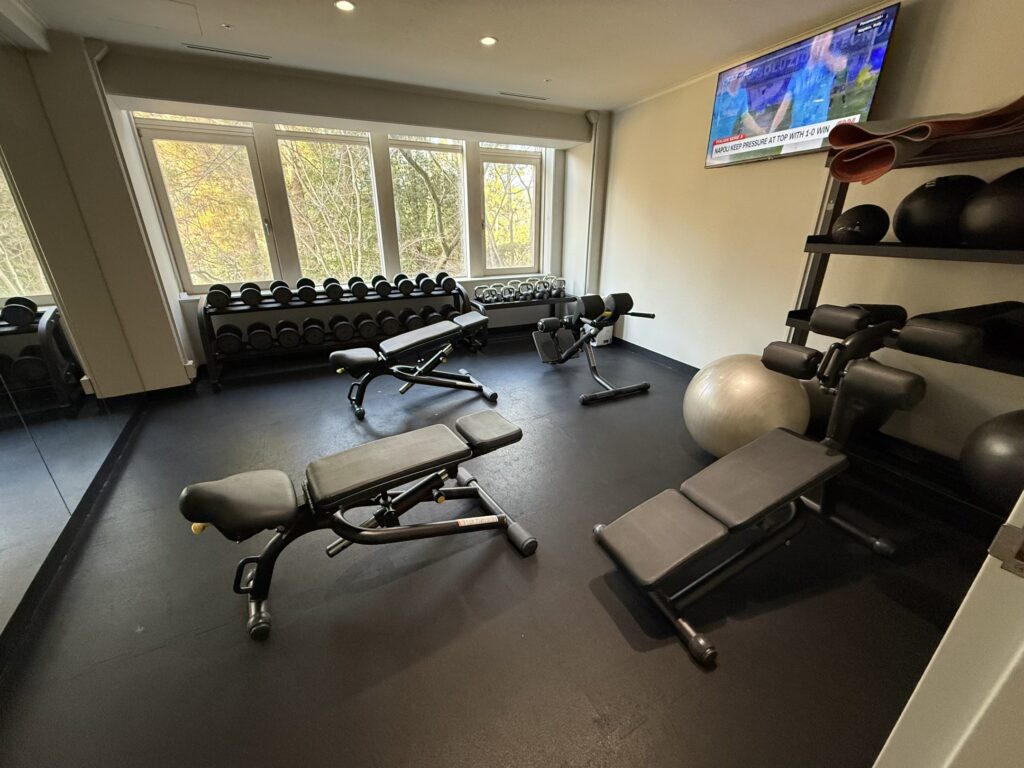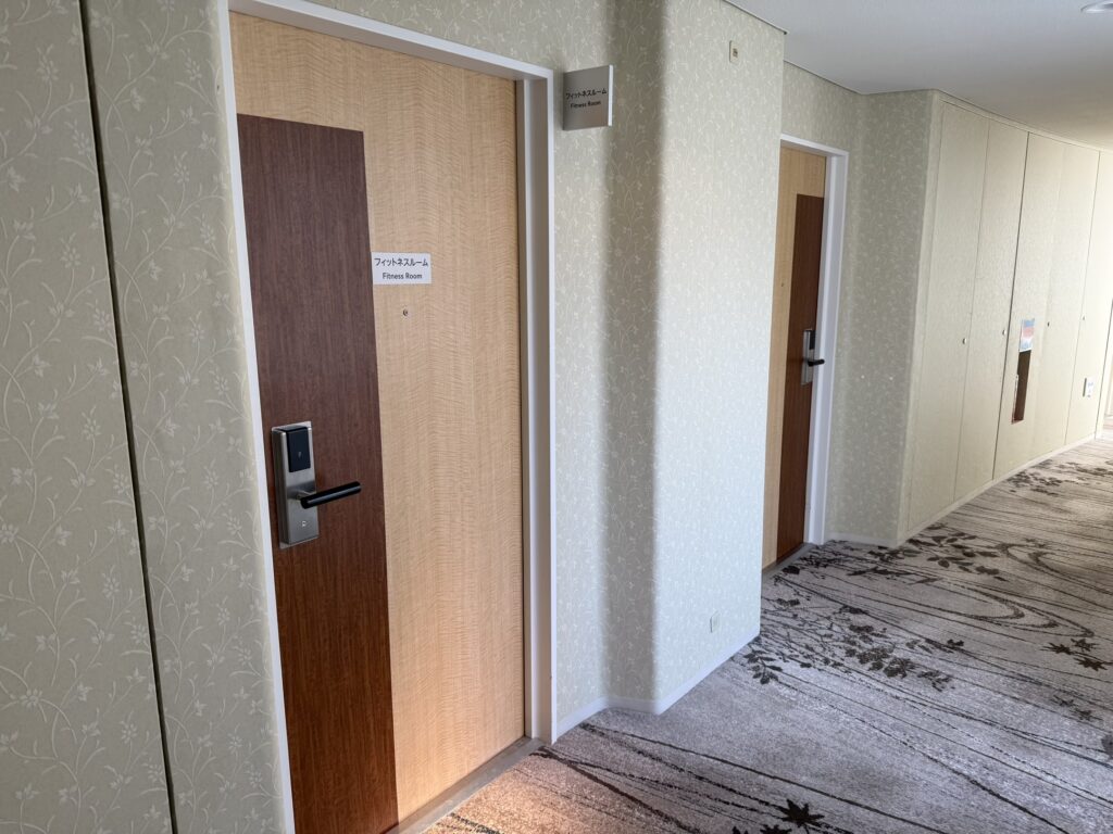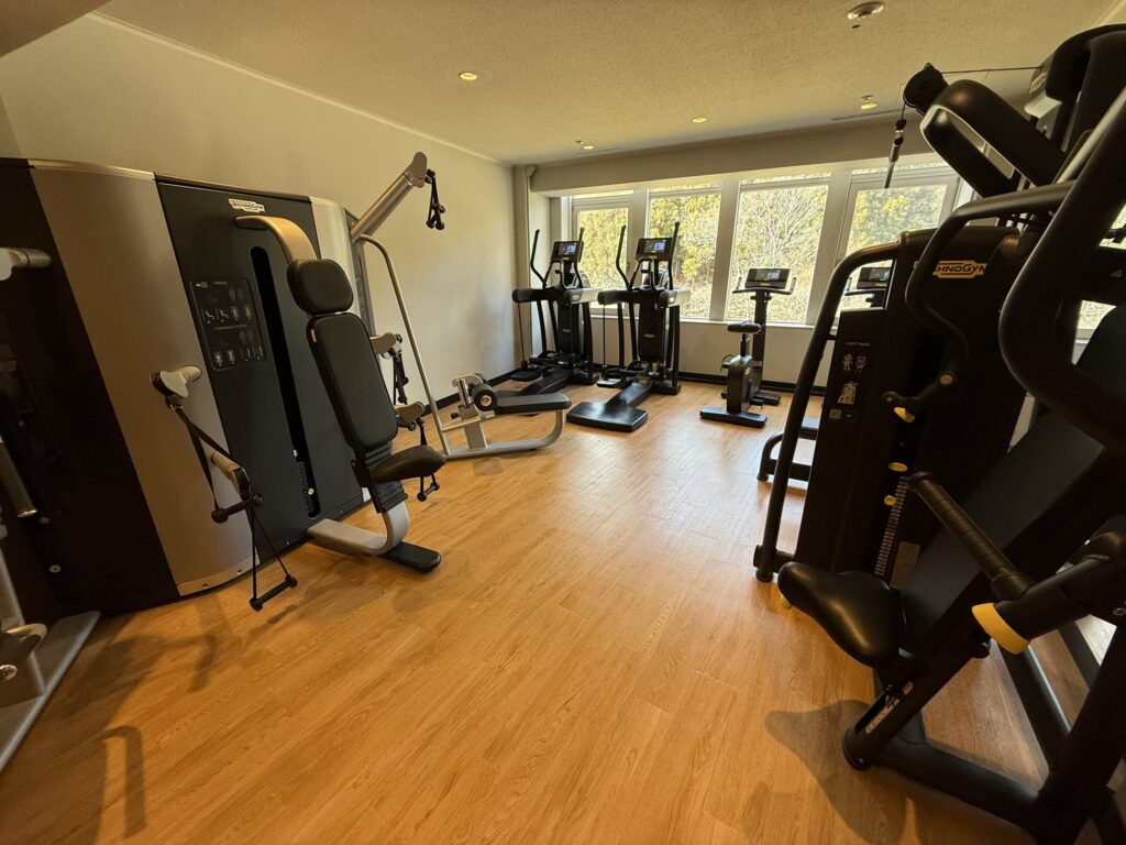 2階には24時間利用できるフィットネスルーム。入った瞬間は狭いかな~と思いましたが、意外と奥行きがあり、トレーニングマシンは種類豊富でがっつり筋トレできそうです。