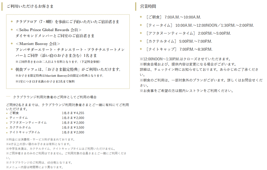 ラウンジアクセスでの朝食、アフタヌーンティー、カクテルタイム
